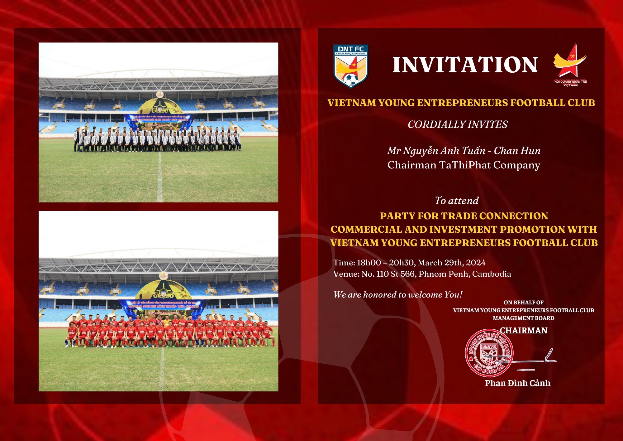 Thư mời Chủ tịch HĐTV Công ty TNHH Tài Thịnh Phát tham dự buổi tiệc thân mật cùng 2 đội bóng tham dự trận bóng đá giao hữu