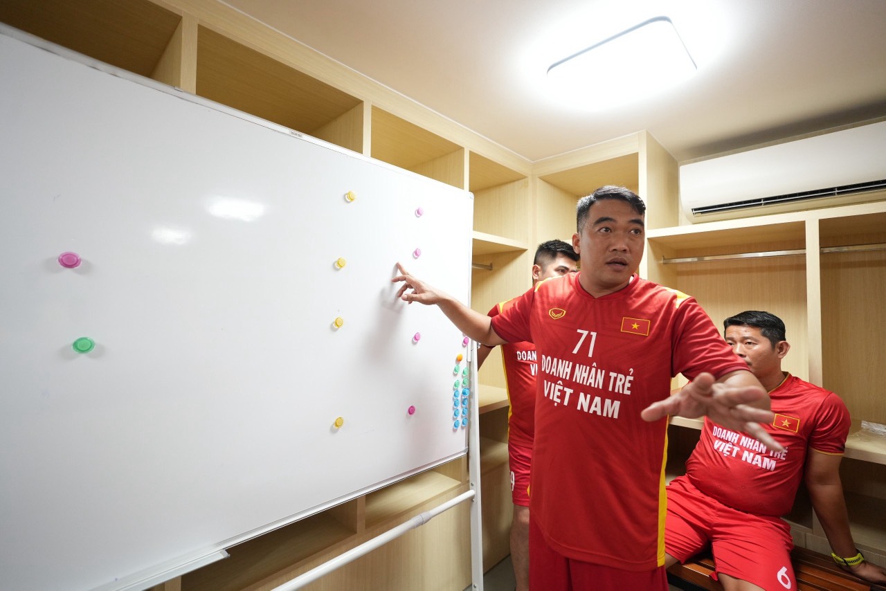 Các cầu thủ Câu lạc bộ Bóng đá Hội Doanh nhân trẻ Việt Nam bàn chiến thuật trước khi ra sân