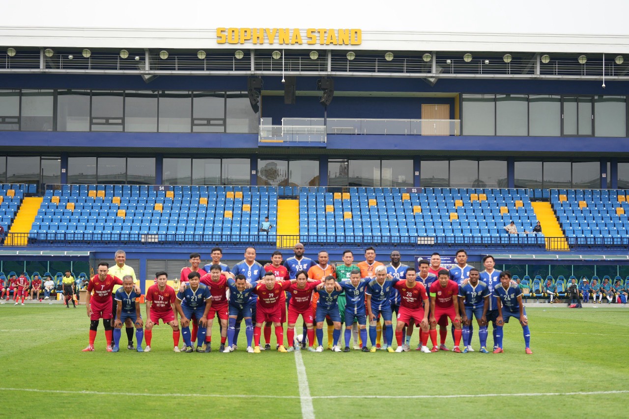 Đội hình ra sân của Đội bóng Câu lạc bộ Bóng đá Doanh nhân trẻ Việt Nam và Đôi bóng Quân đội nhân dân Campuchia