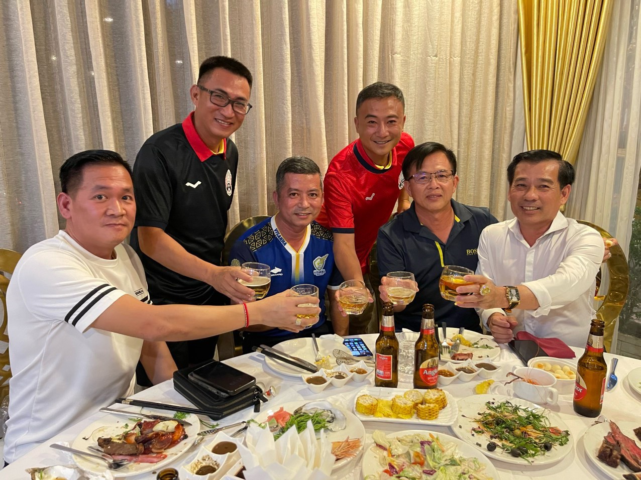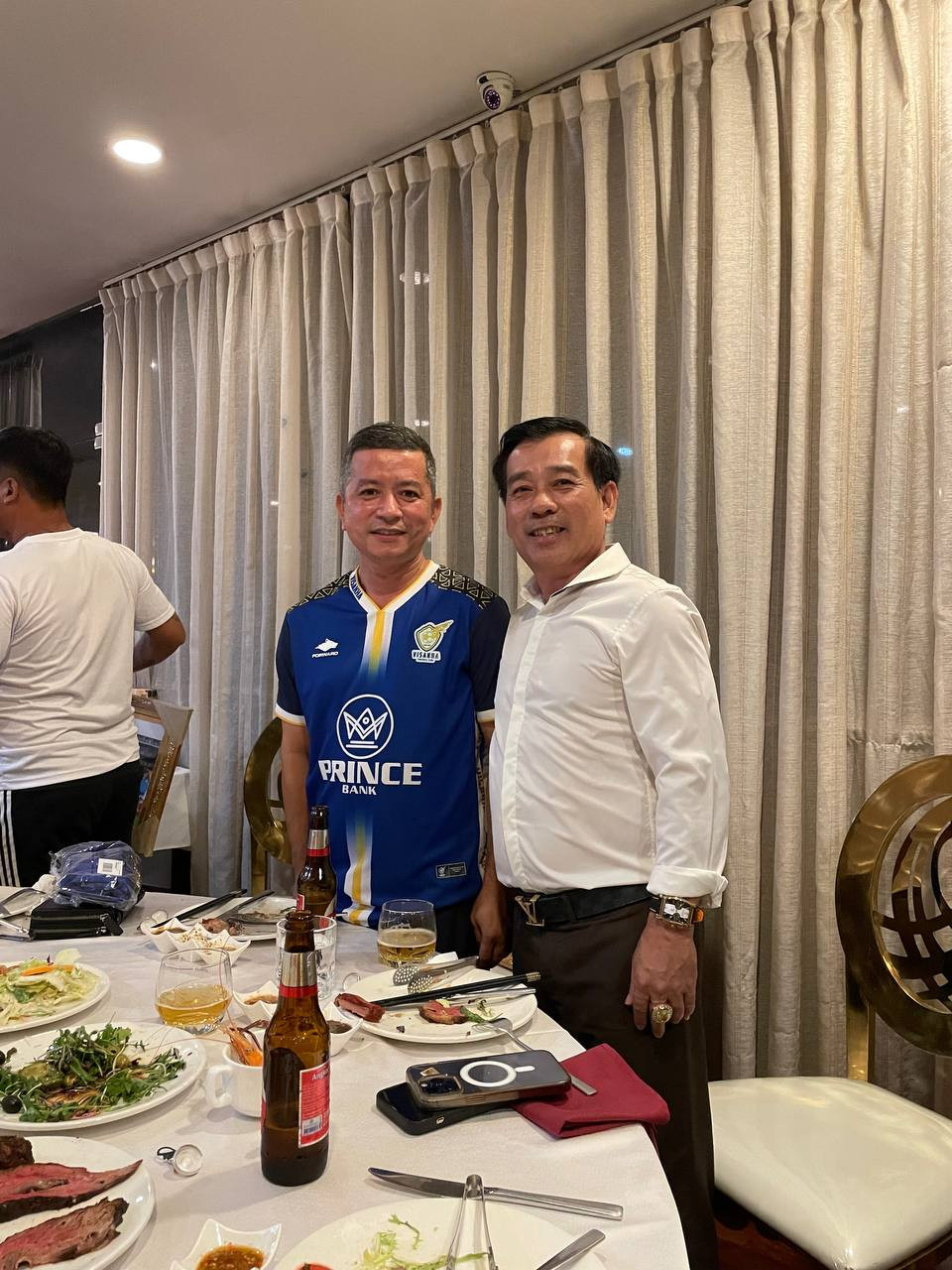 Cùng tham dự buổi tiệc thân mật còn sự góp mặt của Thiếu tướng Ork Samnang Phó Chánh Văn phòng Bộ Hiến binh Campuchia (áo đen ngồi) và Thứ Trưởng Bộ Công an Campuchia (áo xanh dương)